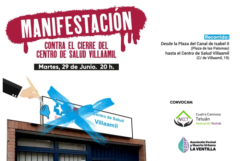 Pero las asociaciones vecinales ya han levantado la voz y el próximo 29 de junio han convocado una Manifestación contra el cierre del centro de salud. La marcha partirá a las 20h de la Plaza del Canal de Isabel II («Plaza de las Palomas») y terminará en el Centro de Salud Villaamil. Izquierda Unida hacemos un llamamiento general a todo el vecindario de Tetuán y de Madrid a apoyar esta manifestación.